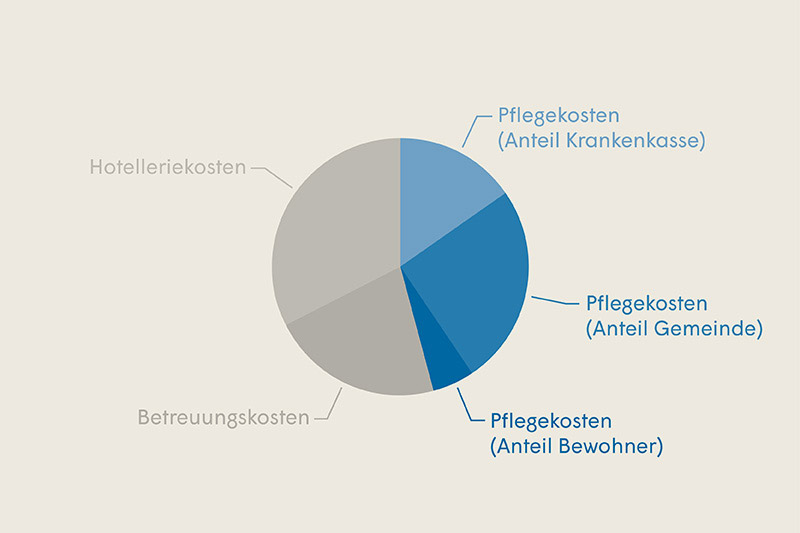 Die Pflegekosten werden nach einem kantonal vorgegebenen Schlüssel auf die Bewohnenden (Eigenanteil) und im Wesentlichen auf die Gemeinde und die Krankenversicherung aufgeteilt.